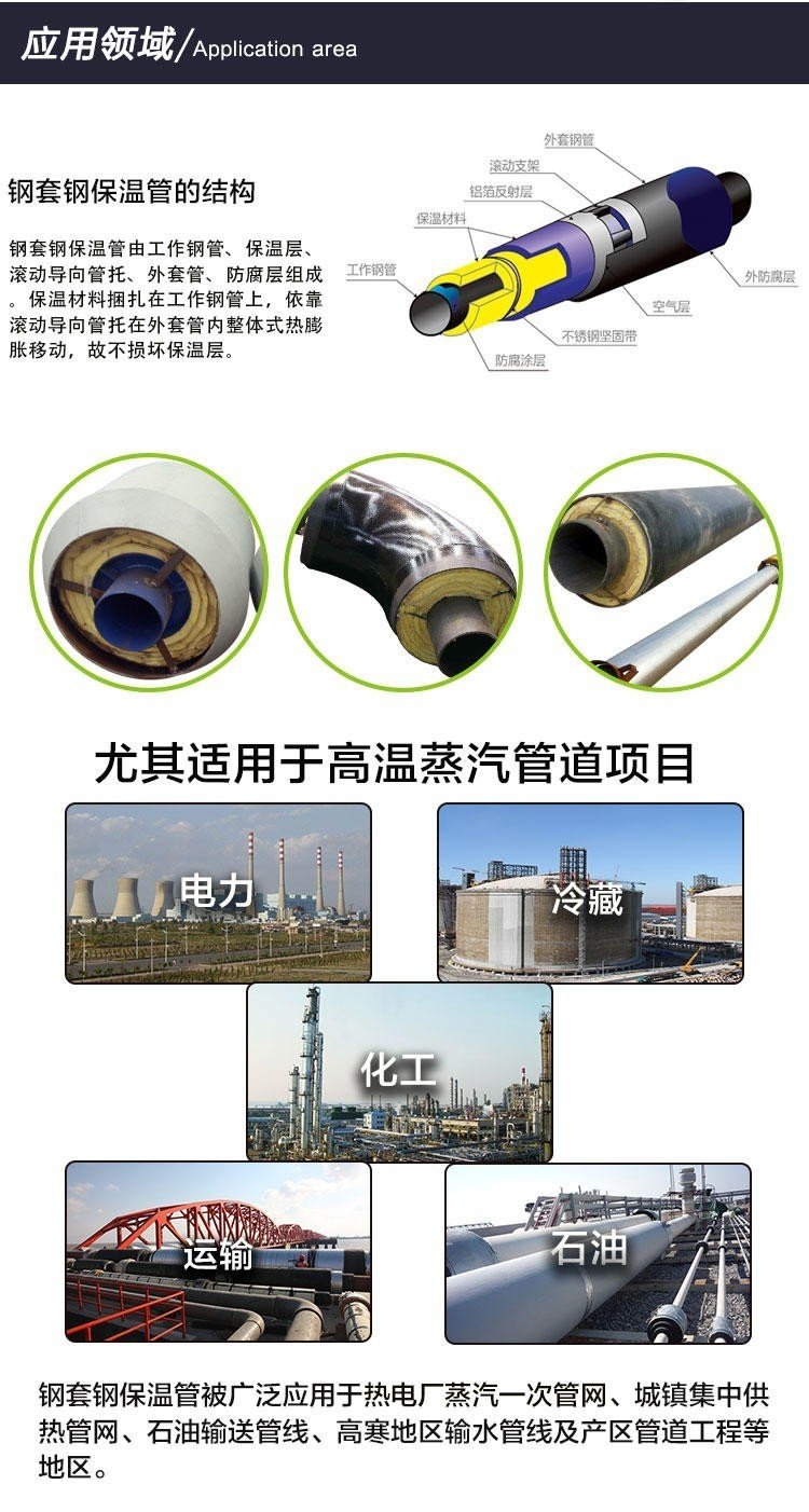 鋼套鋼保溫鋼管是一種高效節能的管道系統,由內工作鋼管、保溫層和外護鋼管組成。它采用先進的復合保溫技術和防腐工藝,在供熱、石油、化工、制冷等領域得到廣泛應用。鋼套鋼保溫鋼管主要用于液體、氣體等介質的輸送,特別適用于需要高溫或低溫保溫的管道系統。