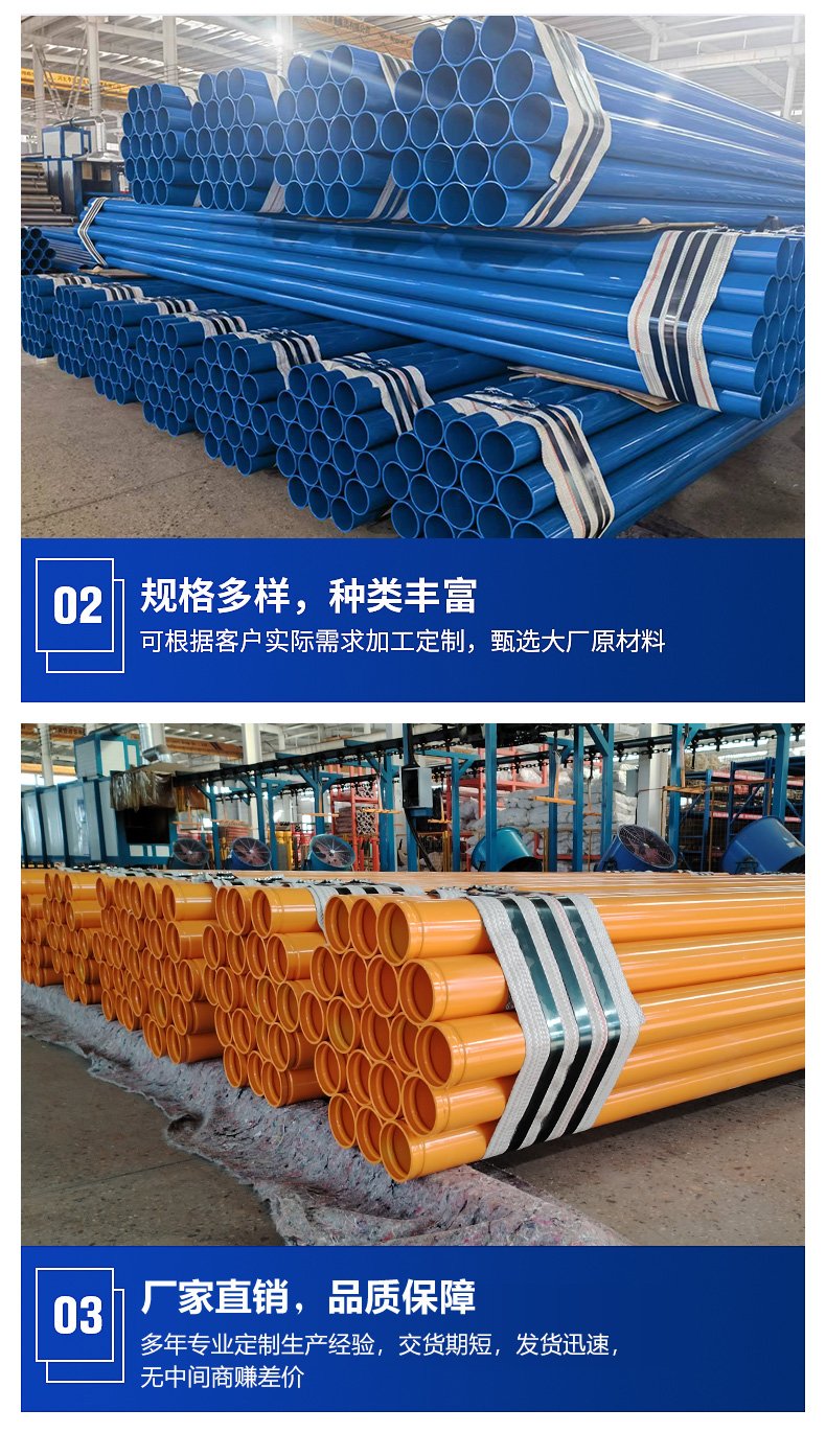 2. **優良的機械強度**:與普通鋼管具有同等優良的機械強度,對沖擊、彎曲及壓力具有很強的承受力,使用壓力范圍通常≤5.0MPa。