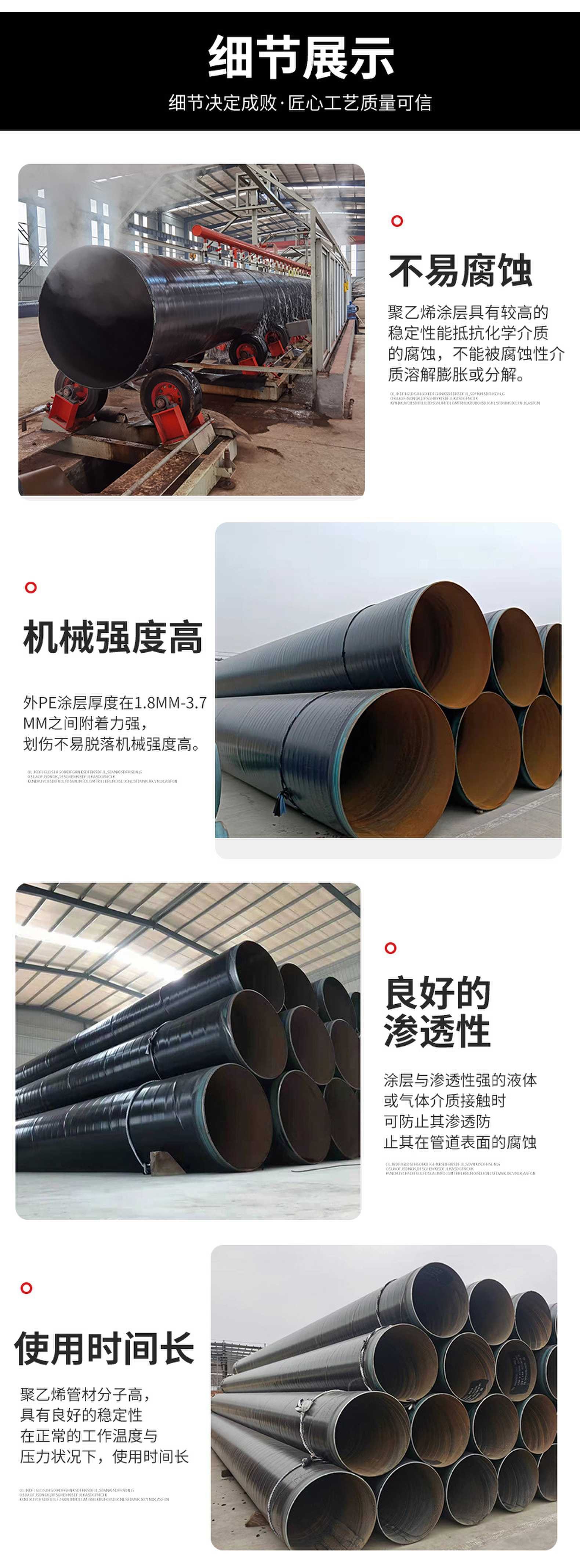 該產品具有良好的環保性能。其 3PE 防腐層采用環保型材料制成,環氧粉末、膠粘劑和聚乙烯等材料均無毒無害,在生產、使用和廢棄處理過程中不會對環境造成污染。在管道的長期使用過程中,不會釋放有害物質污染土壤、水源或空氣,符合現代社會對于環境保護的嚴格要求。尤其是在一些對環保要求較高的領域,如城市地下管網建設、飲用水輸送管道等工程中,加強級 3PE 防腐螺旋鋼管能夠很好地滿足綠色建筑和可持續發展的需求,為環境保護貢獻力量。