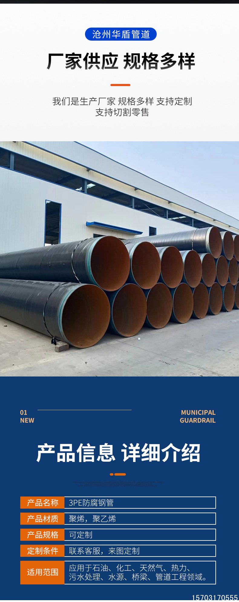 加強級 3PE 防腐螺旋鋼管在經濟性方面具有顯著優勢。其生產過程相對簡便,相較于一些復雜的防腐鋼管生產工藝,它不需要過多的特殊設備和繁瑣的工藝流程。在原材料采購方面,3PE 防腐涂層所使用的材料來源廣泛,成本相對較低。環氧粉末、膠粘劑和聚乙烯等原材料在市場上供應充足,價格較為穩定,能夠有效控制生產成本。在大規模生產過程中,這種成本優勢更為明顯,能夠滿足工程項目對于經濟性的要求,在保證管道防腐性能的前提下,為項目節省大量的資金投入,提高整體的經濟效益。