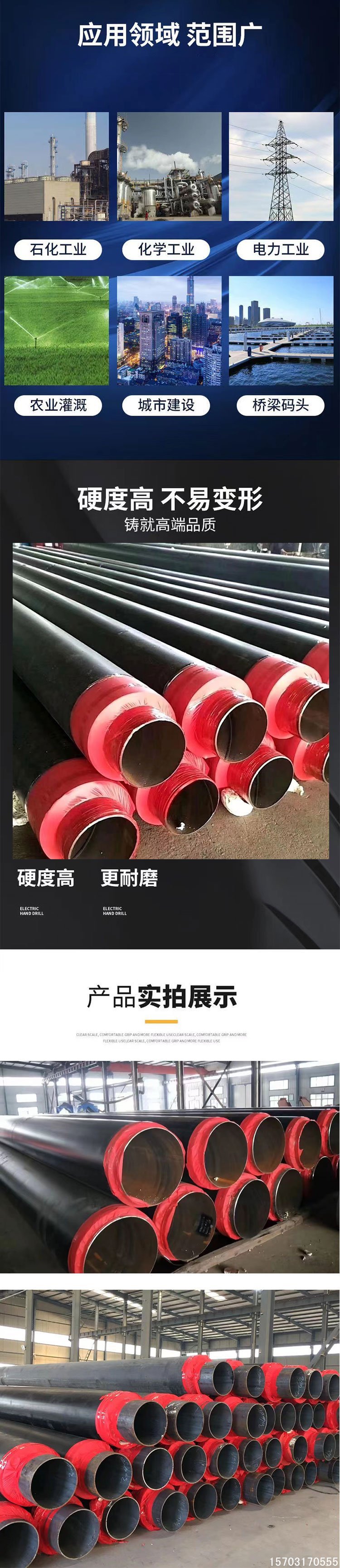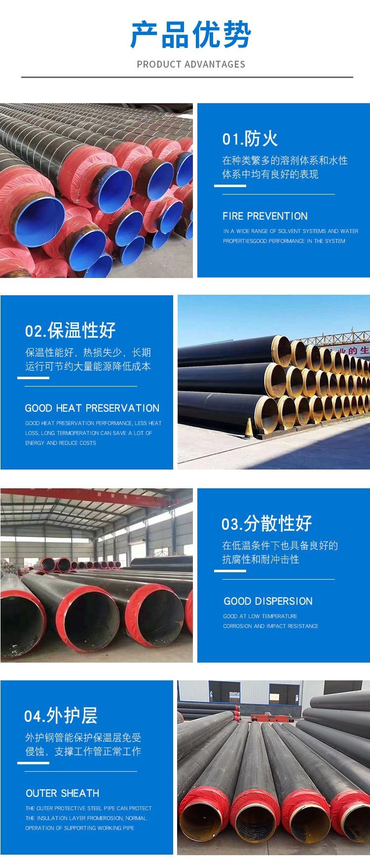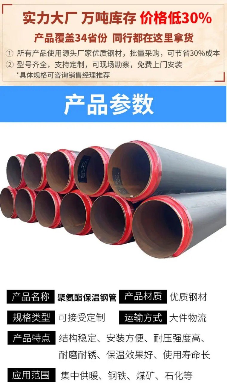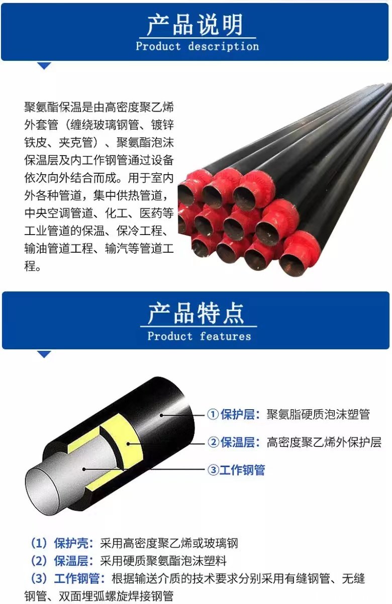 • 防水性能:聚氨酯保溫層閉孔率高,外保護(hù)殼密封性能好,整體防水性能優(yōu)異,防止水分滲透進(jìn)入保溫層和鋼管表面。